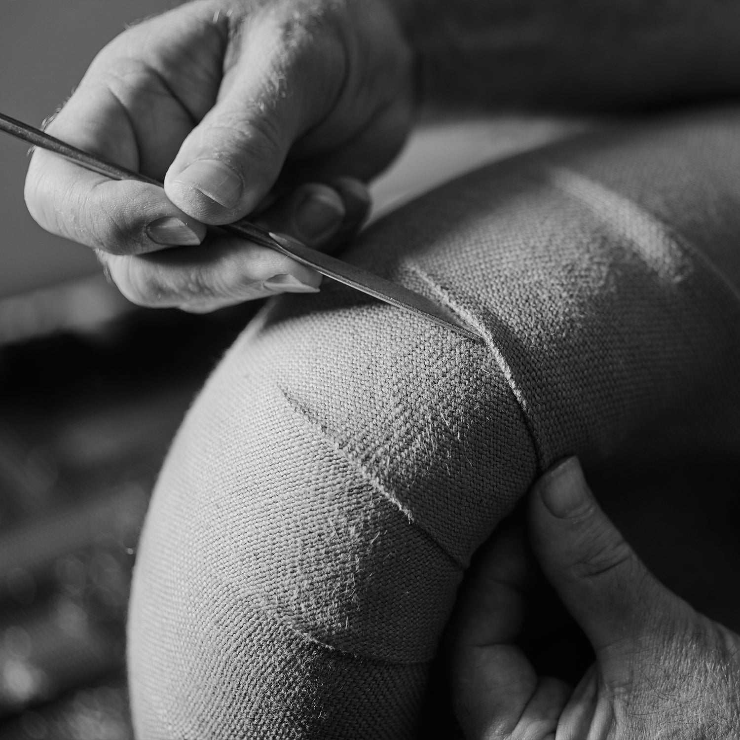 Our craftspeople, whose disciplines range from cabinet making, carpentry, wood turning, and polishing, to pattern cutting, upholstery, machine sewing, and hand sewing, handmake each piece of furniture in our workshop in the heart of Devon.